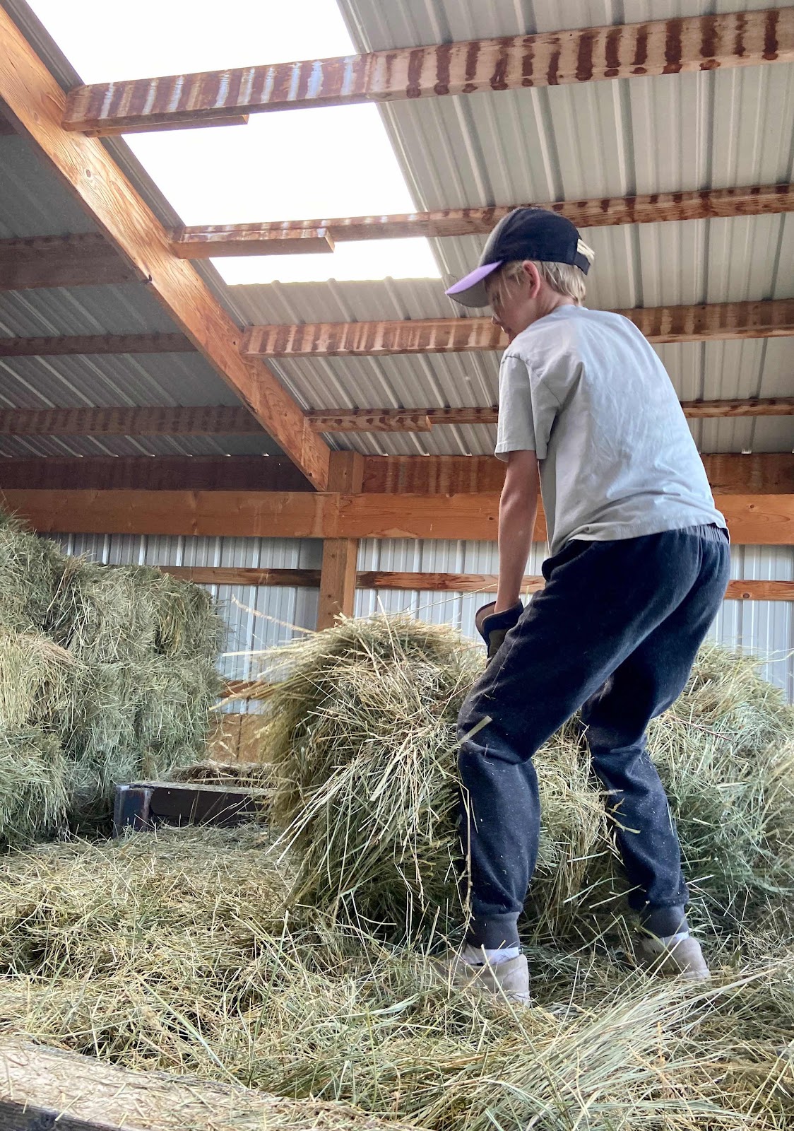 Gabe is especially a lot of help.   He is big enough to do a lot of the loading and throwing of the bales.  It’s the perfect workout for a early July morning.