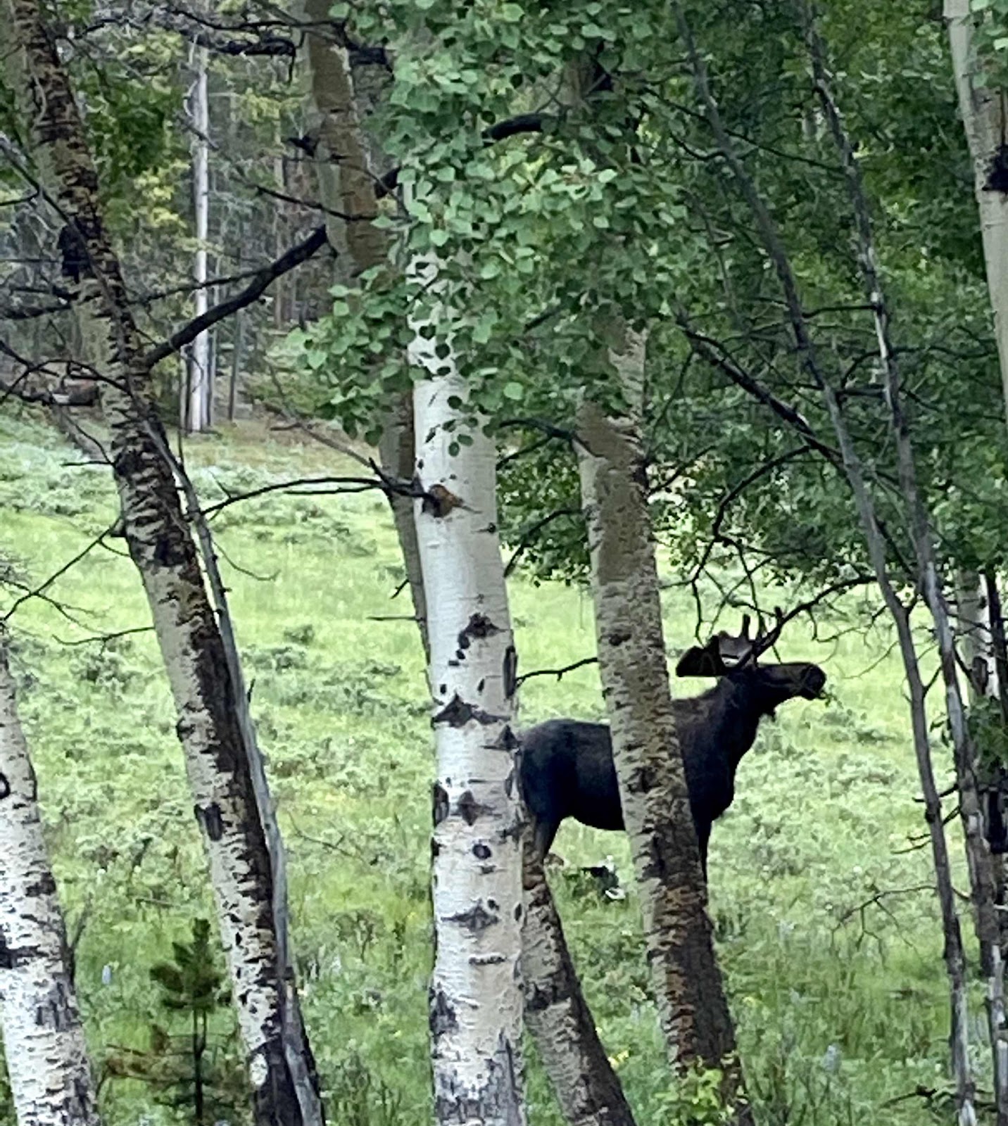 I think one of our favorite things is watching all the wildlife.   We see elk, moose, and deer.   This past weekend there was about 30 head of elk that were in the meadow up from the cabin.    The boys sat on the front porch with a spotting scope and watched them all.   The babies were really little.   Newborns, I think.   So tiny with spots.